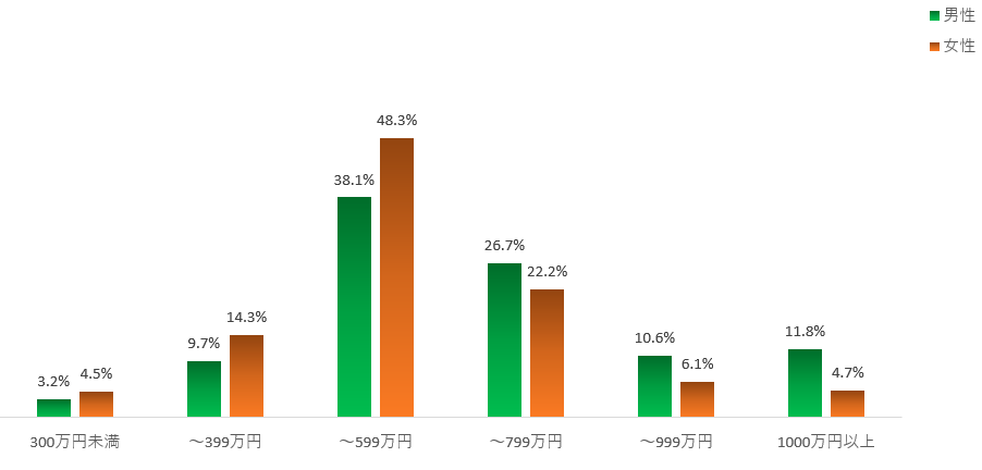 男女ともに、年収は400〜599万円がボリュームゾーン